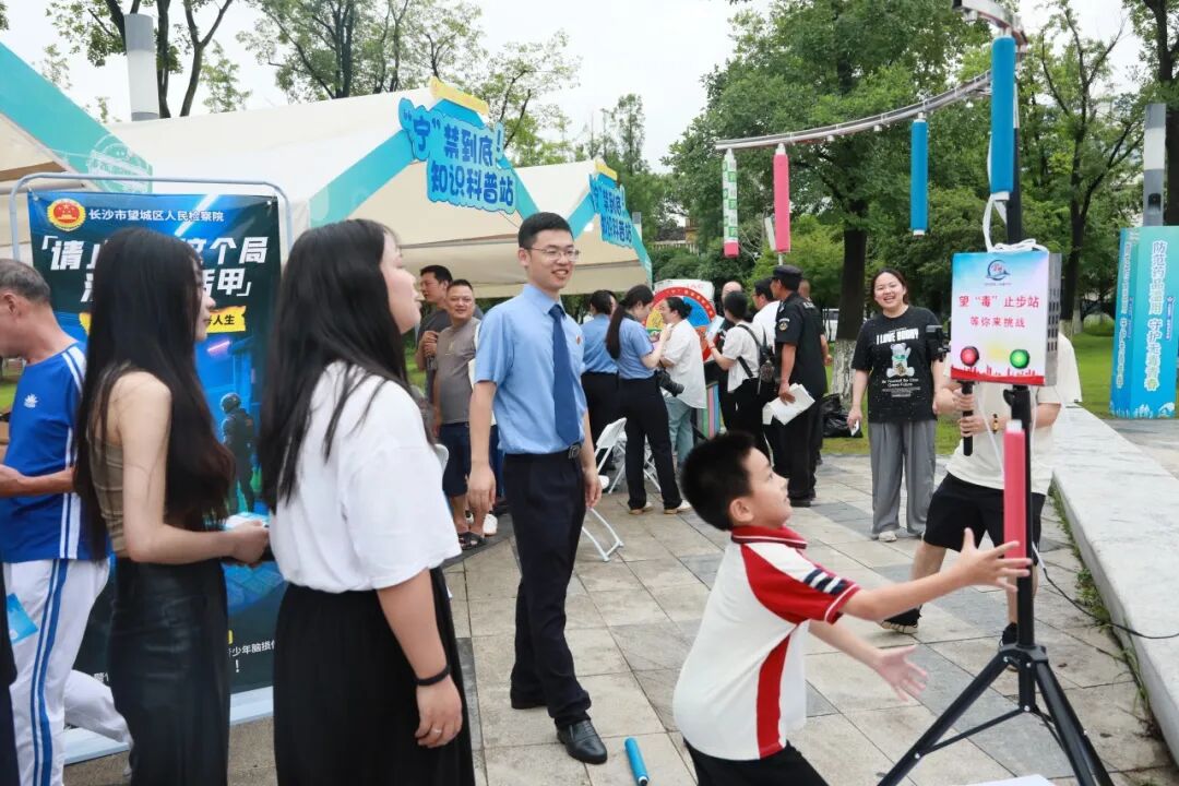 同时,活动现场各宣传点位联动,参与者通过集齐各摊位打卡,还能参与最终抽奖,进一步激发了公众参与活动的热情。活动期间,宣传区域人潮涌动,市民们在各个宣传点位之间穿梭,沉浸式体验禁毒宣传。